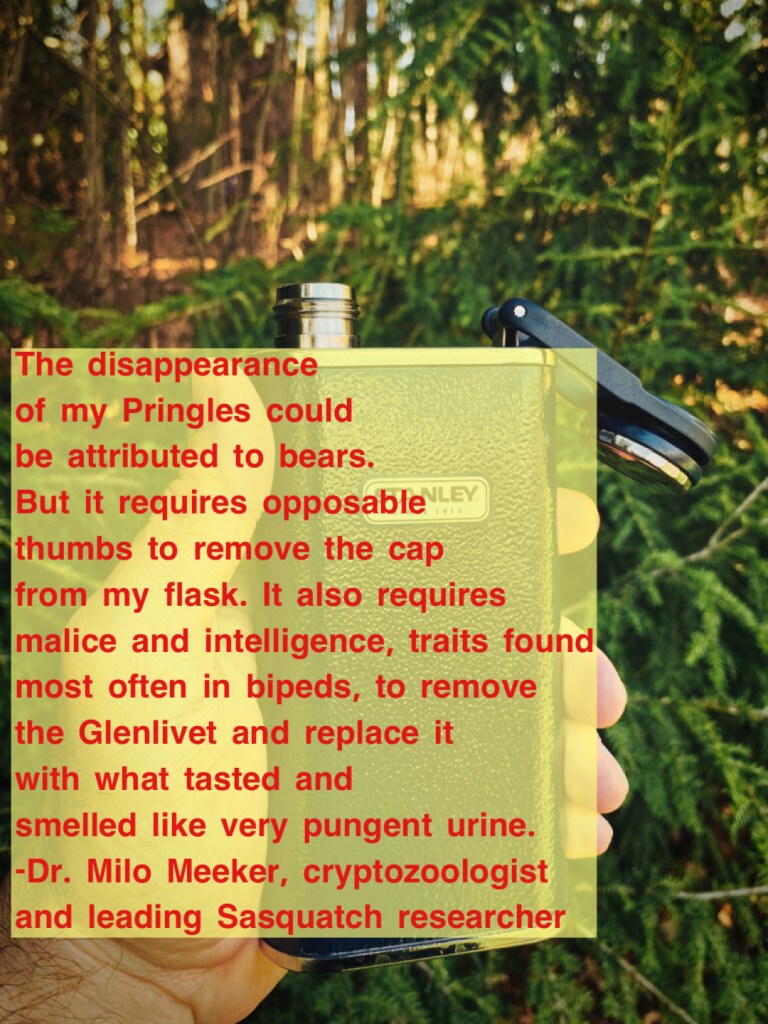 It has also been reported that Sasquatch is fond of fermented and distilled spirits. I myself have found flasks and coolers empty upon returning to my camps. These findings are usually coupled with noting that items like trail mix, Kinder buenos and Cheez-its are left unmolested.