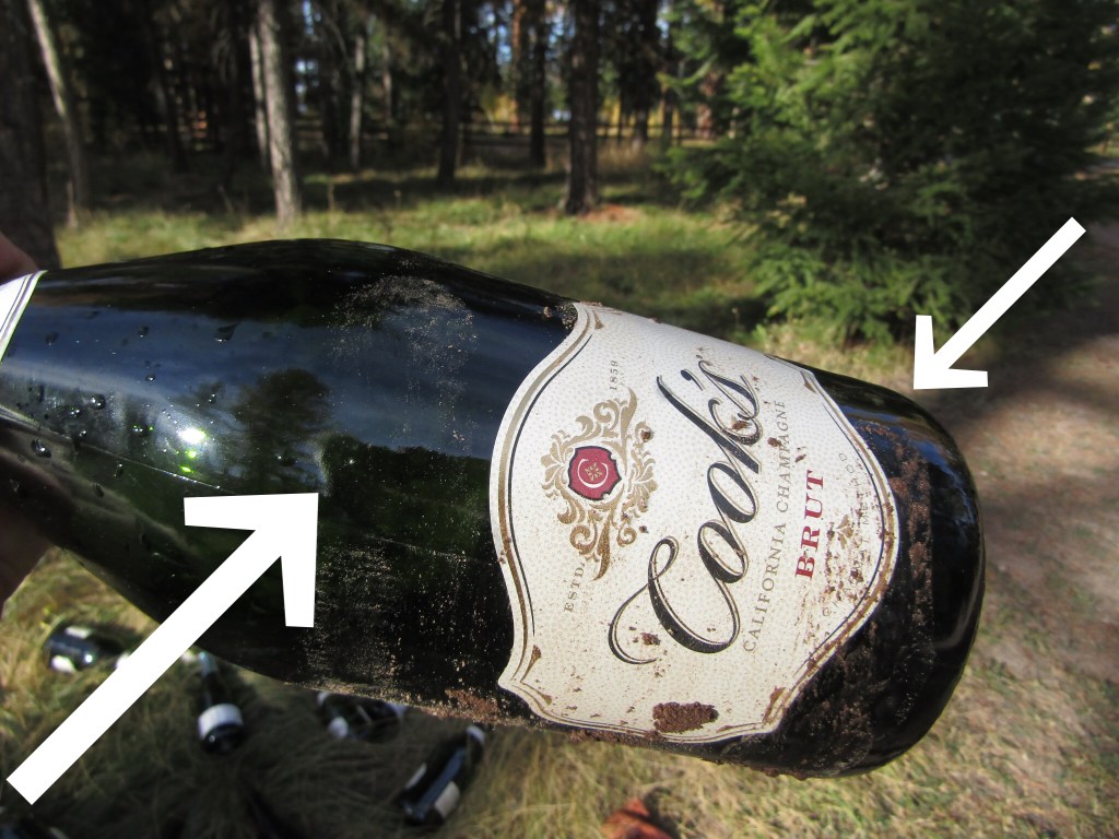 The left image represents 17 empty champagne bottles. Ovando is a rural area, surrounded by several thousand acres of forest land. It is possible that locals were able to break into the truck and empty all the bottles and run away undetected in ONE HOUR. But this is not probable. Note the right image and the prints on this 700ml bottle. There is a clear FINGER print just below the neck that appears to wrap all the away around the 6 inch circumference of this large bottle.