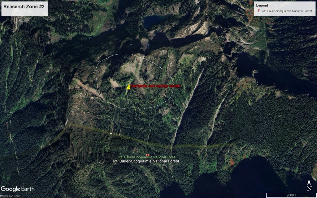 Overview: The weather continues to limit research activities and it’s a challenge to keep my instruments from succumbing to the constant dampness. I have set up a base camp on the slope of the mountain and plan to reconnoiter a five-mile radius from this location in hopes of picking up a fresh trail or better yet obtaining photographic evidence of the subject. Based on the data points I’ve collected and marked on my geographic survey maps of the area, my camp is strategically placed in a high-traffic corridor for any species desiring to traverse the mountain.